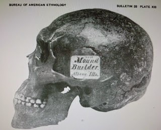 In 1925, in a mound in Indiana, they found the remains of some folks who certainly did not look quite right. Does this skull shape look familiar? There were 8 skeletons in a spoke-like fashion, and a gigantic one among them. In the usual mound-like fashion, copper, precious metals, obsidian, and shells were found in there.